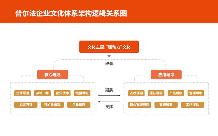 “暖動力”文化的文化主題,統(tǒng)領企業(yè)文化核心理念和企業(yè)文化應用理念。核心理念延展為應用理念,應用理念支撐核心理念。其中核心理念包括企業(yè)愿景、戰(zhàn)略口號、企業(yè)使命、經(jīng)營理念、經(jīng)營方針、核心價值觀、企業(yè)精神。