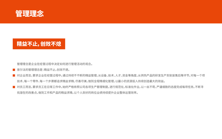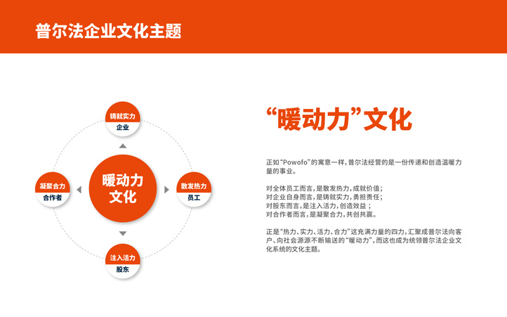 普爾法的企業(yè)文化主題是“‘暖動力’文化”,員工散發(fā)熱力,企業(yè)鑄就實力,股東注入活力,合作者凝聚合力。正如“Powofo”的寓意一樣,普爾法經(jīng)營的是一份傳遞和創(chuàng)造溫暖力 量的事業(yè)。對全體員工而言,是散發(fā)熱力,成就價值;對企業(yè)自身而言,是鑄就實力,勇?lián)熑危粚蓶|而言,是注入活力,創(chuàng)造效益;對合作者而言,是凝聚合力,共創(chuàng)共贏。正是“熱力、實力、活力、合力”這充滿力量的四力,匯聚成普爾法向客戶、向社會源源不斷輸送的“暖動力”,而這也成為統(tǒng)領普爾法企業(yè)文化系統(tǒng)的文化主題。