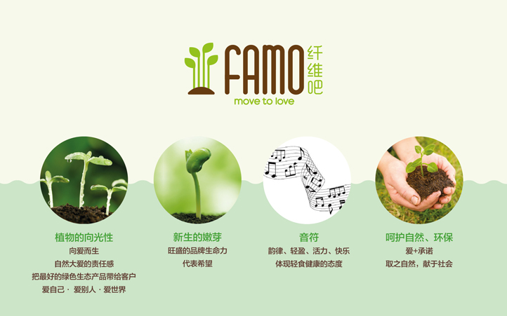 美御在考慮纖維吧品牌VI設(shè)計(jì)的同時(shí),深入研究了纖維吧品牌定位及市場戰(zhàn)略規(guī)劃。整個(gè)品牌圍繞著綠色、生態(tài)、健康、活力、環(huán)保等關(guān)鍵詞。在LOGO設(shè)計(jì)當(dāng)中,整個(gè)LOGO設(shè)計(jì)輕盈而有活力,色彩搭配為咖色和綠色,咖啡色在視覺上寬厚、沉穩(wěn),結(jié)合鮮亮健康的綠色搭配充分體現(xiàn)了品牌健康的態(tài)度。