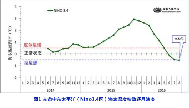 自2014年9月開(kāi)始的超強(qiáng)厄爾尼諾事件于2016年5月結(jié)束后,赤道附近中東太平洋海表溫度持續(xù)走低。8月份監(jiān)測(cè)結(jié)果表明,拉尼娜/厄爾尼諾監(jiān)測(cè)區(qū)海溫距平指數(shù)較上月又下降0.05℃,達(dá)到了-0.53℃,表明赤道中東太平洋海表溫度已偏離正常,進(jìn)入拉尼娜狀態(tài)(見(jiàn)圖1)。