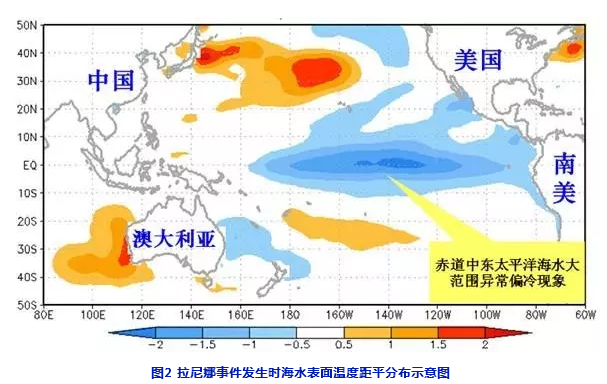 名詞解釋:拉尼娜(西班牙語(yǔ)“LaNina”),原意是“小女孩”,也稱為“反厄爾尼諾”,一般以西經(jīng)120~170度及南北緯5度之間的赤道太平洋海區(qū)的海溫距平指數(shù)來(lái)判定。當(dāng)該區(qū)海溫距平低于-0.5℃,則稱之為進(jìn)入“拉尼娜狀態(tài)”;若“拉尼娜狀態(tài)”持續(xù)5個(gè)月以上,則判定為一次“拉尼娜事件”(見(jiàn)圖2)。拉尼娜事件一般2至7年發(fā)生一次,1950年以來(lái)共發(fā)生了14次!袄崮取焙汀岸驙柲嶂Z”都是導(dǎo)致全球氣候異常的重大天氣氣候事件之一。