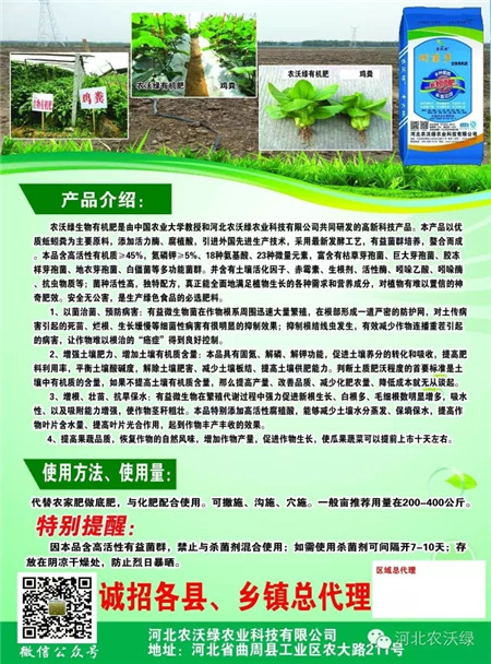 每畝應(yīng)施用腐熟的家園肥4000~5000公斤,或農(nóng)沃綠生物有機肥200~400公斤,可較好地提高土壤有機質(zhì)含量,抑制部分有害微生物的活動。同時,根據(jù)不同作物的需求在有機肥中配施一定數(shù)量的鉀肥,可以緩解或減輕對枯萎病的危害;蛘呤褂酶乘犷惍a(chǎn)品改良土壤。