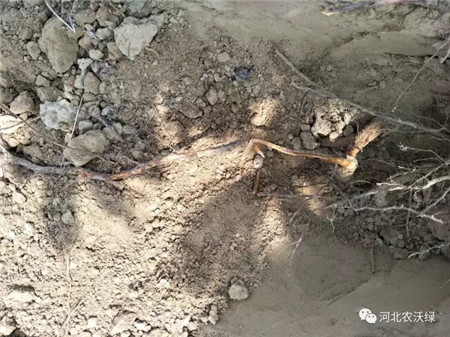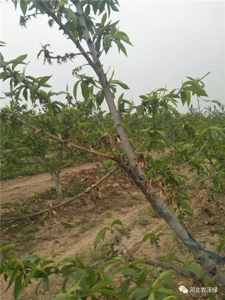 以上圖片是在今年春天立旺桃樹種植專業(yè)合作社的負責(zé)人找到我們時給我們看的照片。據(jù)了解,去年立旺桃樹種植專業(yè)合作社就因為這種情況出現(xiàn)了很多桃樹死棵現(xiàn)象。因此今年張社長輾轉(zhuǎn)來到了我們河北農(nóng)沃綠農(nóng)業(yè)科技有限公司,尋找解決的辦法。公司農(nóng)技師在詳細了解了桃樹的病況和這兩年立旺桃樹種植專業(yè)合作社的施肥情況后采集了果園的土樣進行了化驗,綜合分析后認為是桃樹根腐病和流膠病等混合表現(xiàn),給出了解決方案,使用農(nóng)沃綠VT-1000菌液200倍液灌根處理。