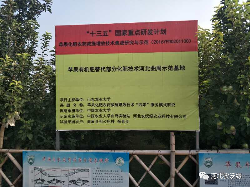 快到果園的時候,遠遠看見一個豎立起來大的牌子,牌子上寫了一行大字“十三五”國家重點研發(fā)計劃?磥恚迕袼苑翘!這更激起了筆者的好奇心,又往前走進了一些,“蘋果有機肥替代部分化肥技術(shù)河北曲周示范基地”的字樣也就映入了眼簾。似乎看出來筆者心理的疑惑,張大哥這才笑呵呵的講起這片果園故事的由來。