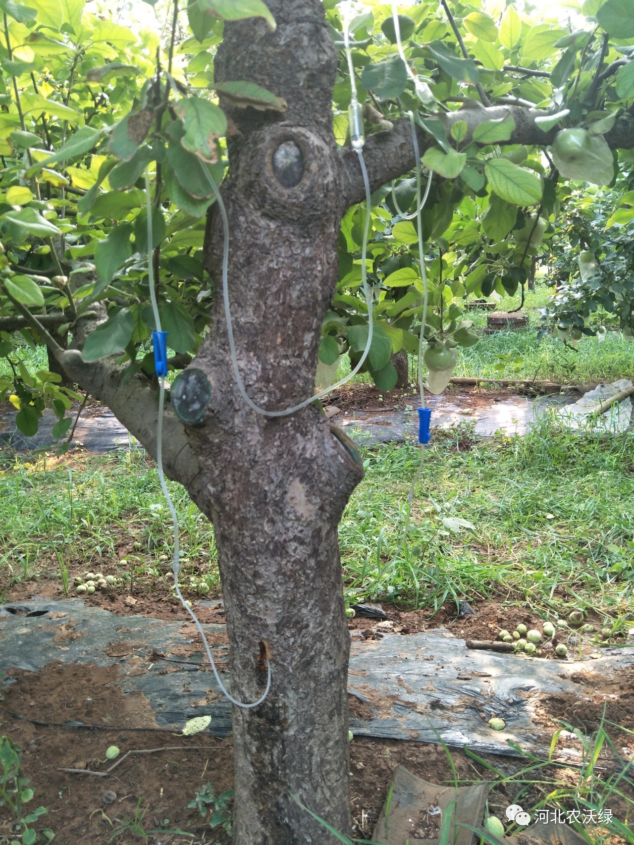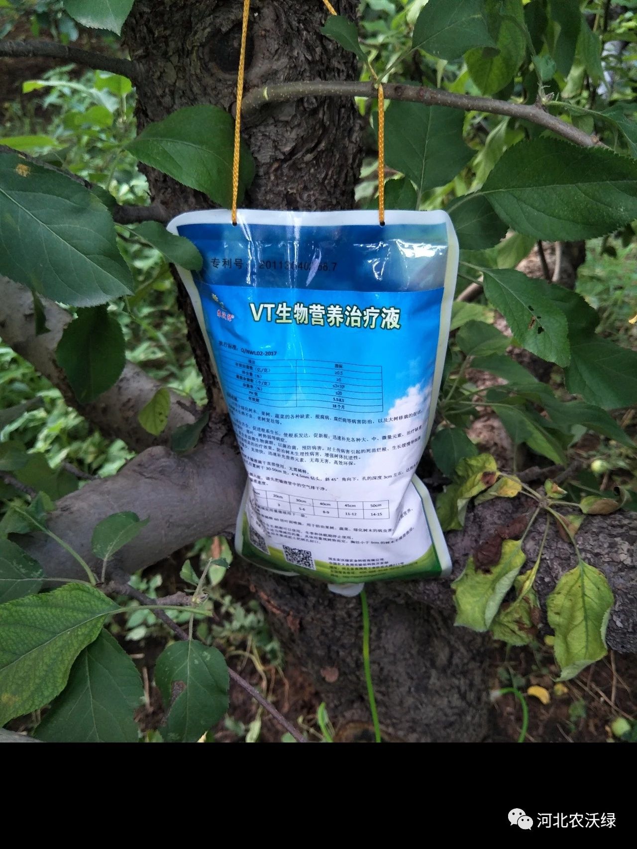 按照工作人員的指導(dǎo)施肥和管理后張大哥覺得果園今年長勢比往年要好,掛果量也明顯增多了?吹叫Ч髲埓蟾缬致(lián)系了工作人員,希望對方能幫助他解決蘋果葉片黃化問題,很快就有工作人員來果園了解情況,并向他推薦了使用農(nóng)沃綠VT營養(yǎng)治療液給果樹輸液的方案,可以對果樹黃化采取輸液滴干治療的方式解決果樹病癥。