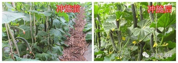 沖施農沃綠水溶肥前后對比:沖施后黃瓜長勢好,瓜條直,商品性很好,開花坐果多