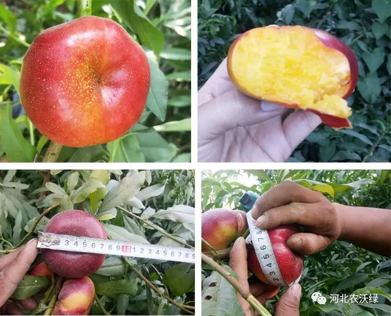 “農(nóng)大2號”油蟠桃:極早成熟,樹勢旺,樹姿開張,自花結(jié)實(shí);果實(shí)扁平,果頂閉合完全,自然條件下,果面潔凈、亮紅美觀;單果重200-250克,果個(gè)均勻,果肉橙黃,硬溶質(zhì),風(fēng)味濃香甜,黏核,含糖量25%左右,直徑7-10cm,果個(gè)周長達(dá)到28cm左右,坐果率高,不易裂果不落果,豐產(chǎn)。果實(shí)成熟后掛樹20天不軟不落,常溫下放置20天不軟不爛,貨架期長,耐儲運(yùn);定植后,十三個(gè)半月開始結(jié)果,溫室種植畝產(chǎn)2000斤,第3、4年陸續(xù)進(jìn)入豐產(chǎn)期,盛果期每畝產(chǎn)量可達(dá)6000斤左右。
