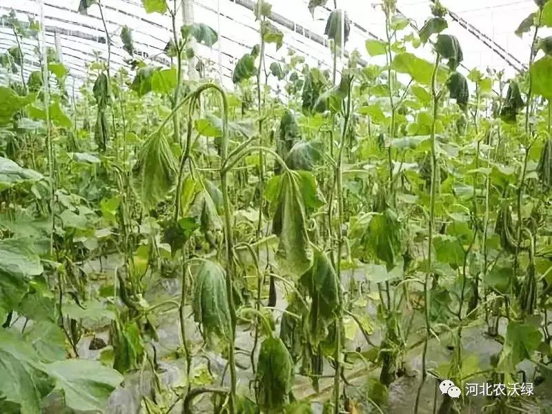 當棚室內氣溫達到48℃時,在短時間內會導致黃瓜生長點附近小葉萎蔫、葉緣變黑的現(xiàn)象,也就是所說的“龍頭”萎蔫。如果高溫時間較長,會出現(xiàn)整株葉片萎蔫如水燙狀。