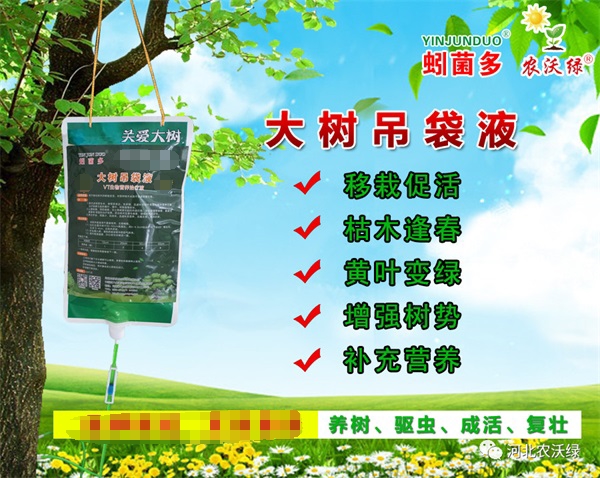 措施:衰老的行道樹由于受特定的環(huán)境限制,養(yǎng)分的供給較少,因此對這類樹木應(yīng)補(bǔ)充養(yǎng)分,有效施肥。可使用農(nóng)沃綠大樹吊袋液給樹體輸液,迅速補(bǔ)充樹體所需養(yǎng)分,促進(jìn)根系生長,使根系發(fā)達(dá),生新根,同時可治療缺素引起的黃葉、落葉、樹勢弱等癥狀。