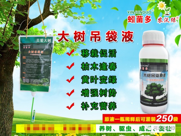 除了使用強力生根劑外,對于大規(guī)格的樹木,種植后用農(nóng)沃綠大樹吊袋液補充營養(yǎng),促進根系生長,增強樹勢,促進其成活率。