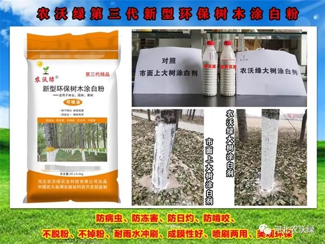 新型涂白粉(又叫防蟲涂料):農沃綠生產的新型環(huán)保樹木涂白粉,第三代精品樹木涂白粉是農沃綠公司和農大專家采用納米技術共同研發(fā)的又一環(huán)保新產品,成膜性好,粘著牢固不脫落,比老產品在性能和使用便利上都有所提升,大大降低了使用成本。