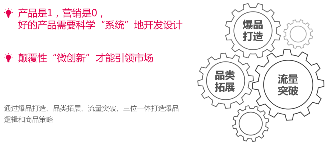 產品塑造的核心,是對用戶的洞察創造,從單純的占領“產品品類”轉向經營“年輕人和產品”,最終營銷一種“品牌綜合體驗”或“生活方式”??梢酝ㄟ^爆品打造、品類拓展、流量突破,三位一體打造爆品邏輯和商品策略。