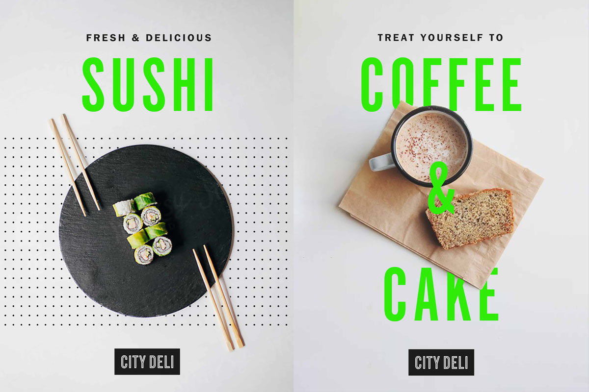 城市熟食店品牌設(shè)計采用的單色標識,它使用霓虹綠的閃光作為亮點。定制圖標與用于包裝、標牌、POS、制服和社交媒體的簡單圖案一起創(chuàng)建。